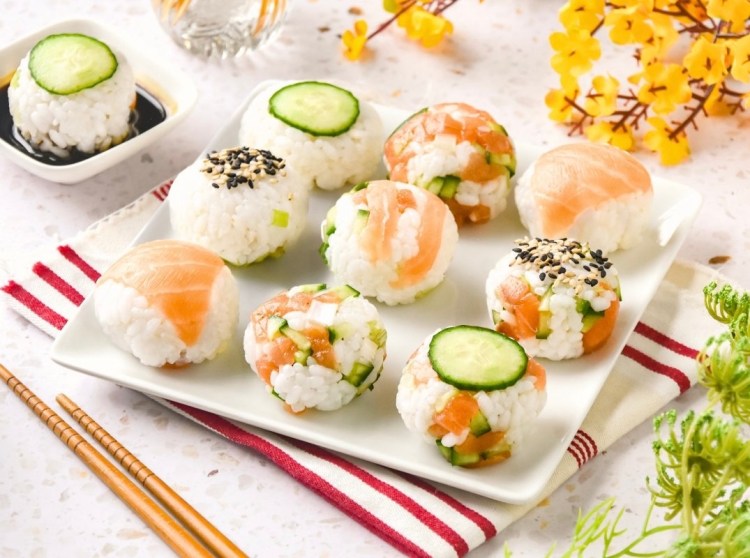 Pepino, aguacate, queso philadelphia, tampico y por fuera salmón, queso philadelphia y aguacate.